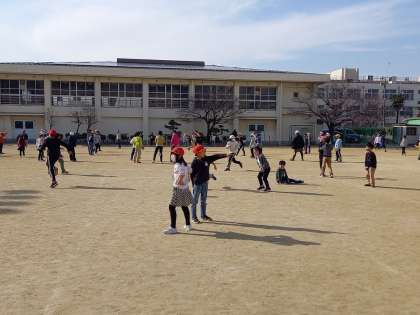 昼休みにはたくさんの子が運動場で、おにごっこやドッジボール、長縄などをして、楽しそうに遊んでいました。