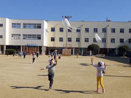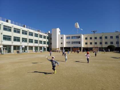 今日は1年1組が“凧あげ”をしました。