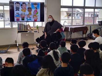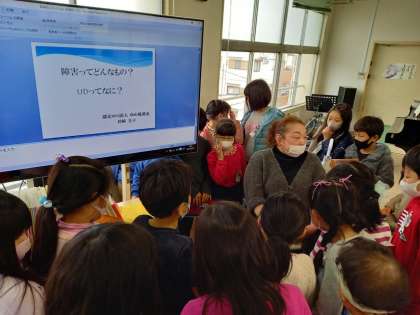 今日は先日の車いすダンスに続いて、車いすで生活されている方を地域からお招きし、子どもたちに話をしていただきました。日頃、子どもたちが当たり前だと思っていることが、車いすで生活される方にとっては、大きな障害となってしまうことがあるということ。またすべての人が暮らしやすい町づくりとして、ユニバーサルデザインという考え方があり、子どもたちの身の回りにもさまざまな工夫があることを分かりやすく紹介していただきました。子どもたちは電動で動く車いすに驚きを抱きながらも真剣に話を聞き、自分たちが心がけることを考えていました。