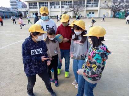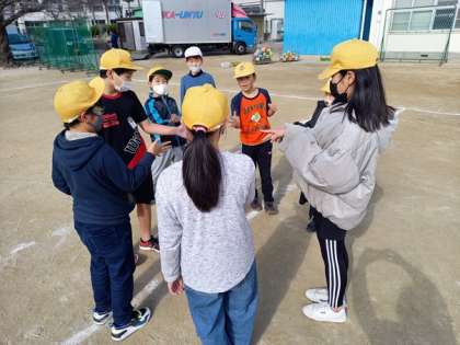 6年生と3年生が班になって、運動場で一緒に遊びました。
