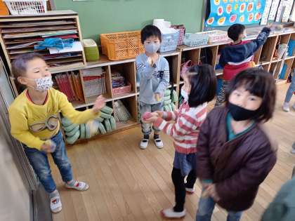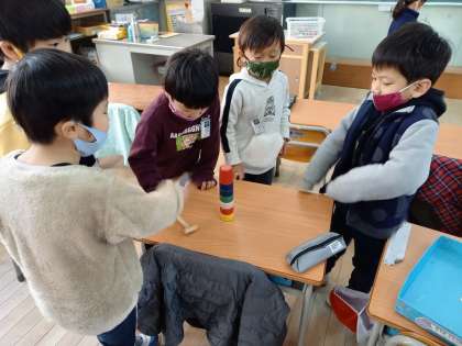 今日は1組で、「おじゃみ」「けん玉」「「だるま落とし」をしていました。
