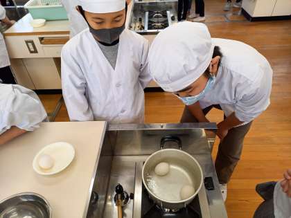 5年生は家庭科で「ゆでたまご」をつくりました。