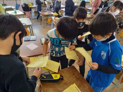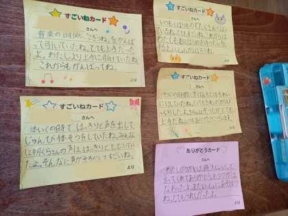 「すごいねカード」「ありがとうカード」を書き終わると、お友だちに渡しに行きます。