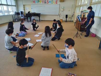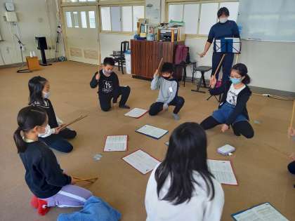 「校内ドコドコドン」に向けて取り組んでいる4年生。