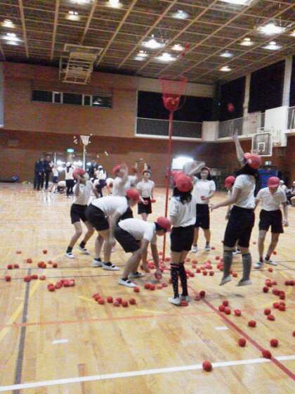 玉入れや大玉転がし、台風の目など、懐かしい競技に出場者は大ハッスル。見ている子たちも大声援を送っていました。