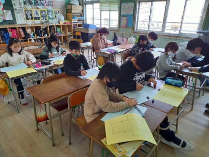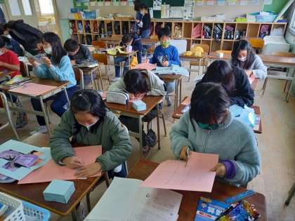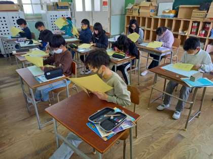 直方体の箱を辺にそって切り開いたてん開図を方眼紙の上にかき、実際にはさみで切り取って組み立てると、元の直方体の形になるか確認をします。
