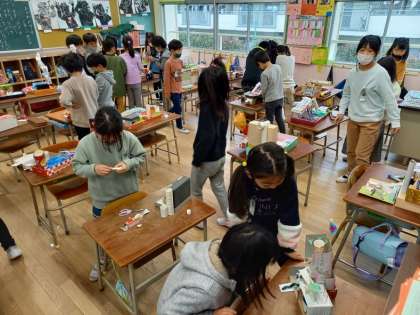 おうちから持ってきたさまざまな形の空き容器を使って、友だちをご招待する「おうち」をつくってきました。