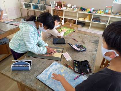 5年生の図画工作は多色刷りで行う木版画の学習をしています。