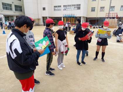 また、メッセージカードのプレゼントも行われ、心のこもったメッセージを、子どもたちは真剣に読んでいました。低学年の中には、思わず涙ぐむ子も…。