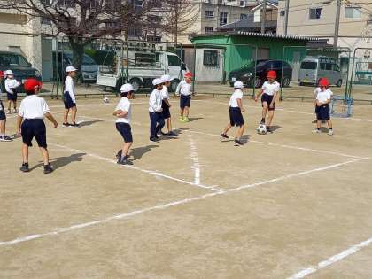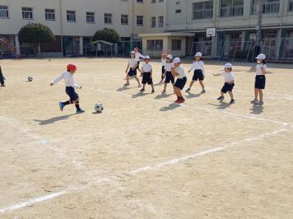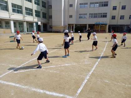 今日も穏やかな天気の中、1年生が体育の授業で、サッカーボールを使っての運動をしていました。