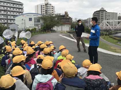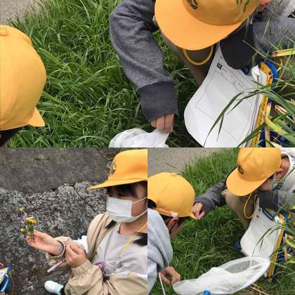 神崎川の堤防まで移動して、春の生きものや草花の観察をしました。野草の中にも昆虫がいるのをみつけることができました。野草の中にもいろとりどりの花を咲かせているのをしっかりと観察して記録することができました。