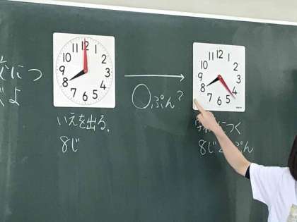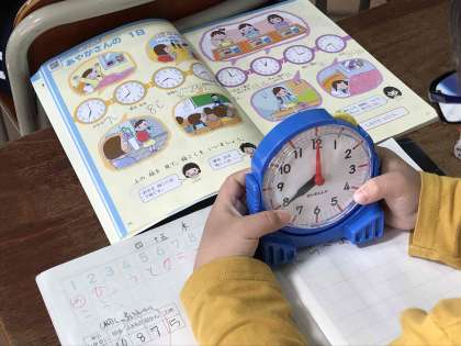 実際の生活の場面を思い浮かべて、時間の概念をとらえる学習です。時計の模型も活用しながら学習しています。