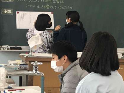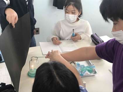 「ものが燃えるときの空気は、どのように入れ替わっているのだろうか」という課題で、実際には空気の流れをみることができないので、線香のけむりを使って観察しました。入れ替わり方について、空気の流れをとらえながら学習しました。