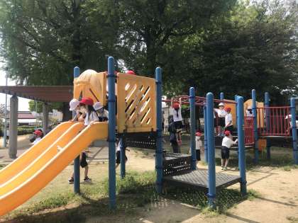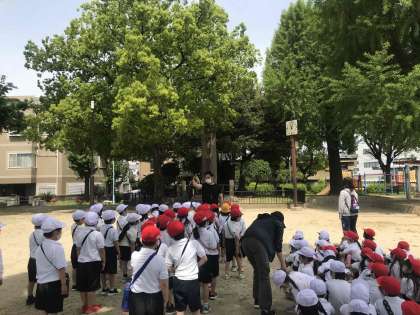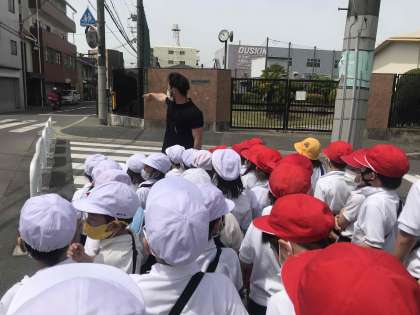先日行った交通安全教室の学習を生かして、校区のおもな通学路で、信号の渡り方、歩道の歩き方のおさらいをしました。須賀の森公園まで歩き、少し休憩をしたり遊具を使ったりして遊びました。