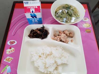 ごはん 牛乳 さけのごまみそ焼き 五目汁 ひじきのいため煮