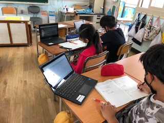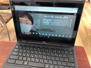 5年生は1時間目の時間に、リモート学習を行いました。担任の先生が授業している様子を登校している児童は教室で、していない児童は家庭で見ながら学習を進めました。登校してきた児童に「どうだった?」と聞くと、「よく見れた!」「できたよ!」と答えてくれました。