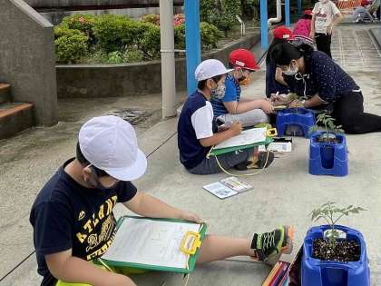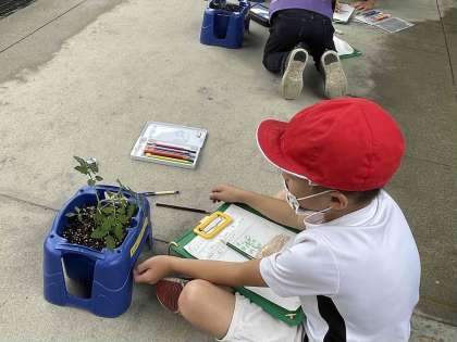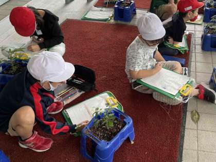 先週、ミニトマトの苗を植えました。水やりをしながら観察を続けています。葉の成長のようすやさわった感じ、色や成長したところを細かく観察しています。
