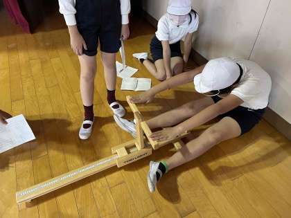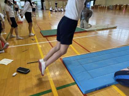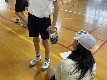本日より4時間授業が可能となり、各教科の学習が本格的に始まっています。体育の学習において、感染予防や密をさけた手立てを行いながら講堂をつかってできる種目の計測をしています。