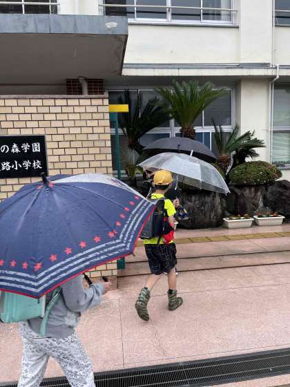 登校時間帯には、強めの雨が降っていました。風もあり少し肌寒い朝を迎えましたが、元気に登校しています。