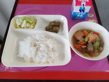 ごはん 牛乳 ちくわのいそべあげ あつあげとさといもの煮もの