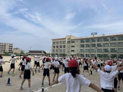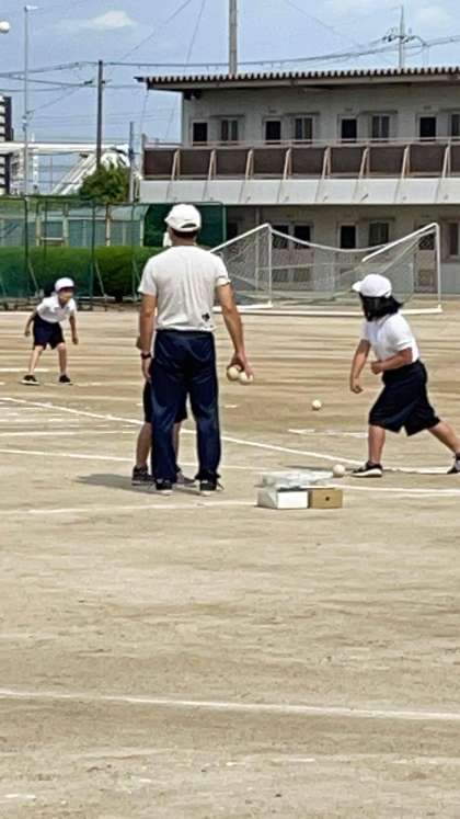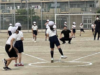 今日は、3年生と4年生が淡路中学校で昨日に引き続きソフトボール投げの計測を行いました。中学校の運動場は、とても広いです。