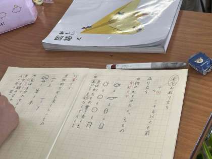漢字の成り立ちについて、物のかたちからあらわしたもの、事がらを印などであらわしたもの、漢字を組合せて新しい意味をあらわしたもの、音をあらすものと組合わせたものなど、さまざまな成り立ちがあることを学習しています。
