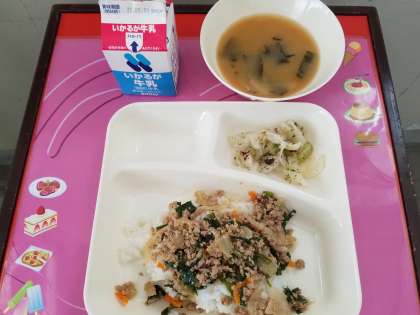 牛乳 豚ひき肉とにらのそぼろ丼 みそ汁 キャベツの赤じそあえ