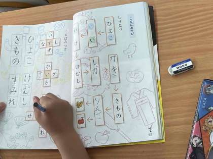 ことばみつけをすることで、語彙力を身につける学習をしています。パズルのようにことばの組み合わせを考えて、マスを埋めながら想像力を働かせています。