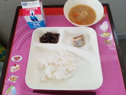 ごはん 牛乳 さごしの塩焼き みそ汁 牛ひじきそぼろ