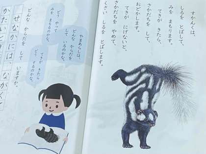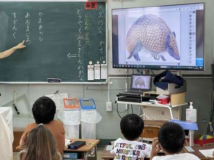 ヤマアラシやアルマジロ、スカンクなどの動物が、どうやって自分の身を守るのか、国語の教科書を読み取って、気づいたことを発表しています。