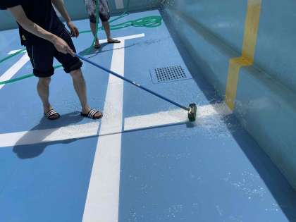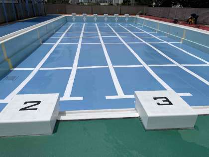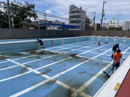 いよいよプール水泳の開始に向けた準備が進んでいます。水をいったん抜いて汚れをキレイにとっています。今日のようなお天気になると、プールに入れば気持ちがいいです。