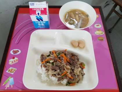 牛乳 牛丼 とうがんのみそ汁 白花豆の煮もの