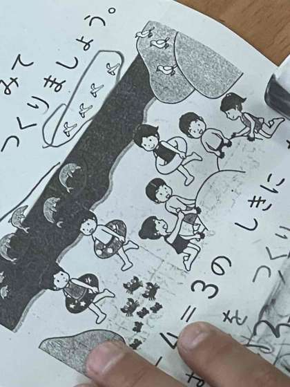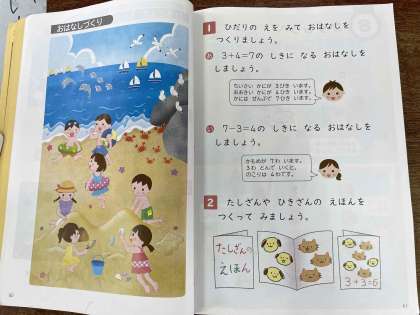 算数で、おはなしづくりを通じて、○○のこりは?○○どちらがおおい?○○ちがいはいくつ?など、実際におはなしづくりをすることでひき算のしくみを理解する学習をしています。