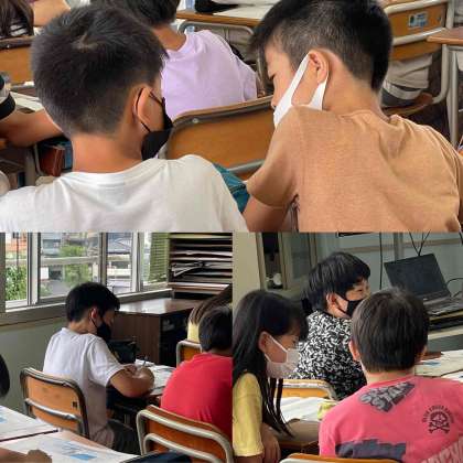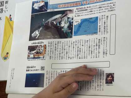 新聞記事を読んで、記事の見出しを考える学習です。ペアで考えた見出しの理由を伝え合い、より根拠となった考えを明らかにします。最後に、実際につけられた見出しを見て、確かめ合いました。何より記事を読んで、自分の考えを持つことができるかが大切です。