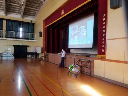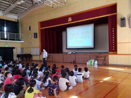1年生〜3年生と、4年生〜6年生に分かれて、講堂で行いました。