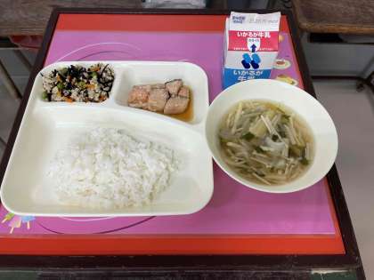 ごはん、牛乳、さけのしょうゆ風味焼き、五目汁、高野どうふのいり煮