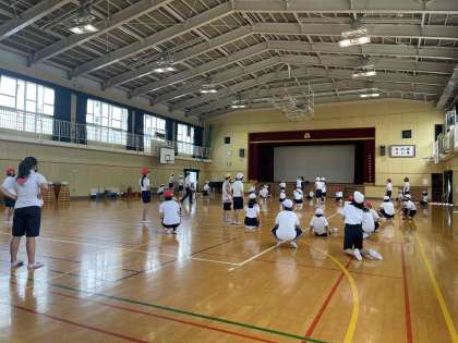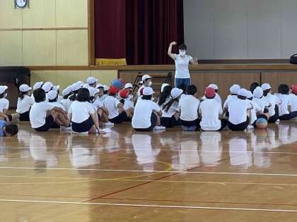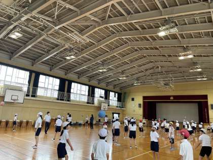 突然雨が降ってきたので、体育館で合同の体育です。ボールを使った基本的なゲームをしたり、グループで対戦したりゲームを工夫しながら運動しています。