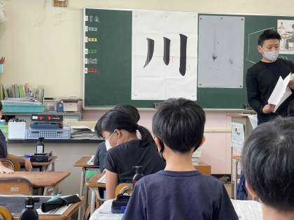 今日は、「川」の字を書きます。「はらい」がはじめて出てきました。筆の使い方に気をつけて書いています。