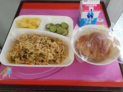 パン、牛乳、焼きそば、きゅうりのしょうがづけ、パイナップル