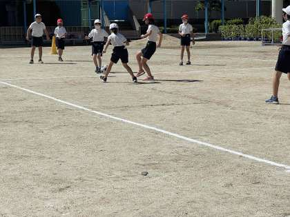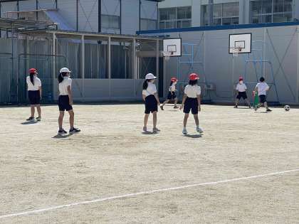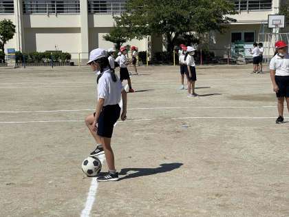 運動場のスペースを有効にいかして、小グループのチームでサッカーの学習をしています。密をさけること、考えて運動すること(作戦を考えゲームする)、などに気をつけて活動しています。