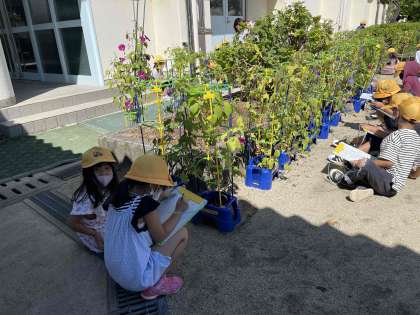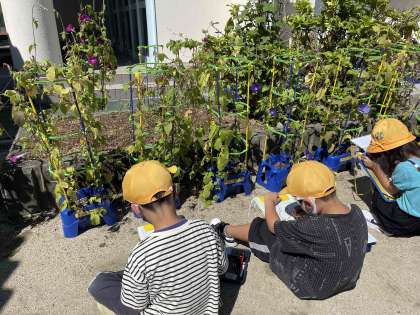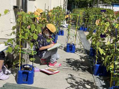 夏休みもしっかりと水やりを続けて、アサガオをみんなで世話をしました。2学期になっていったん家に持ちかえったアサガオを持ってきて続けて観察しています。まだつぼみをつけて咲き続けているのもありますが、咲き終わったところがだんだんと固い実をつけてきものもあります。