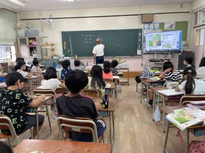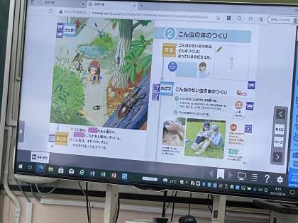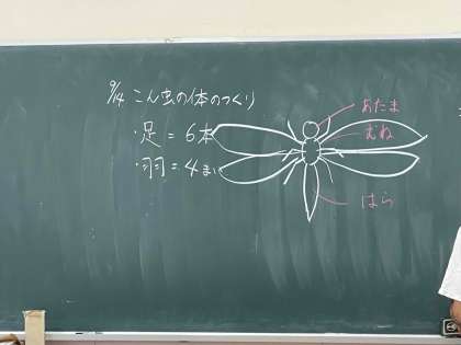 こん虫の特ちょうとして、足の本数や羽の枚数と、頭や胸、はらの位置やこん虫によって口の形のちがいなどに着目して学習しています。
