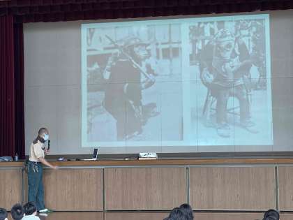 今日は、天王寺動物園から出張授業に来ていただきました。動物園では戦争があった時代に、動物たちがどのような立場にあったのか、今では考えられない悲しい歴史があったお話を聞きました。質問コーナーでもいくつかお話をきかせていただくことができました。