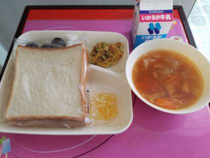 パン、牛乳、豆乳マカロニグラタン(米粉)、トマトスープ