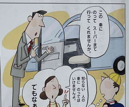 やさしそうな人が困っていて、知らない人にはついて行ってはいけないと言われているけど・・・。そのような場面に遭遇したとき、客観的に状況を見て自分の考えや友だちの考えを聞いて、どうすべきか考える学習です。