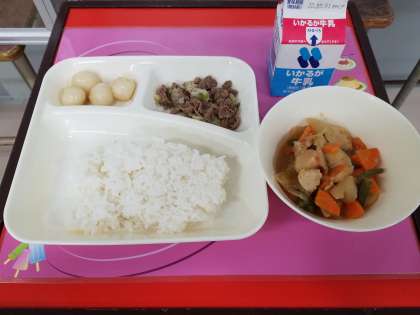 ごはん、牛乳、一口がんもとさといものみそ煮