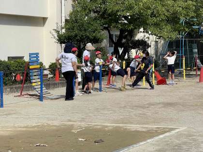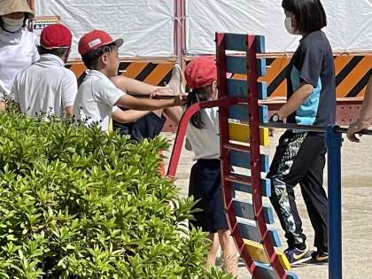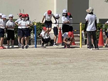 鉄棒の学習をしています。基本の前回り降り、逆あがりの練習をしています。