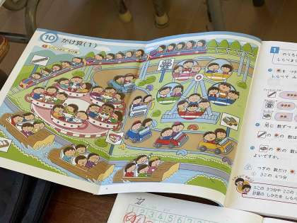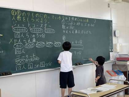 2年生では、かけ算の学習がはじまりました。教科書の絵をみて、のりものに乗っている人数を調べています。かけ算の考え方の基本を学習しています。