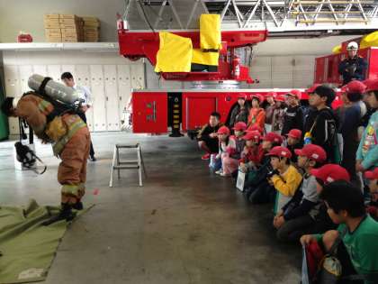 あいにくの雨で、行き帰りは大変でしたが、消防署では消防車を間近に見たり、消防隊員の人たちが持つ機材を見せてもらったりできて、とても充実していました。