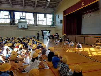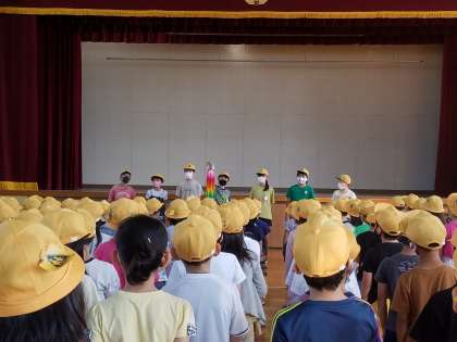 6年生が、修学旅行に向けてつくった千羽鶴を、みんなに披露しました。千羽鶴は、6年生が全校を代表して広島に捧げます。